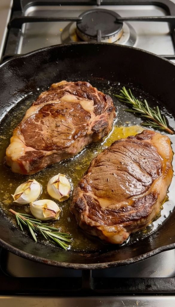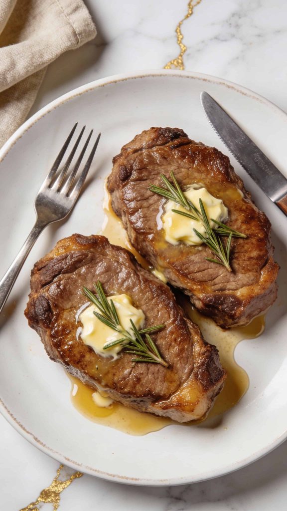 Transfer steaks to a plate. Let them rest for 5–10 minutes so the juices stay inside. Spoon any extra garlic butter on top before serving.