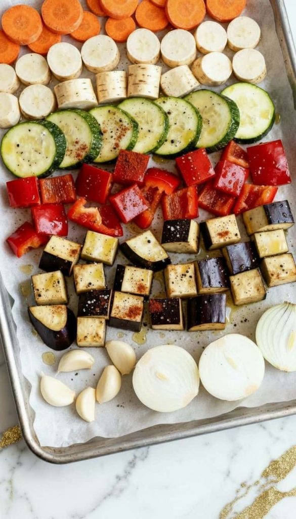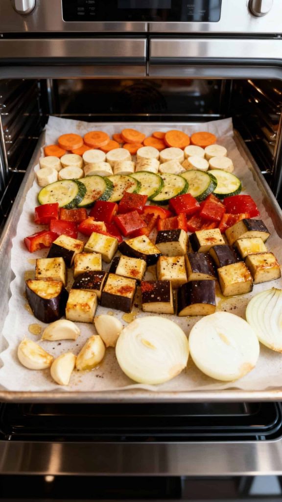 Roast the vegetables at 425°F for 35–40 minutes, stirring halfway through, until soft and browned on the edges.