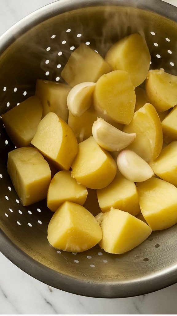 Drain the potatoes and garlic in a colander. Let them sit for 2–3 minutes so the steam escapes—this keeps them from getting watery.
