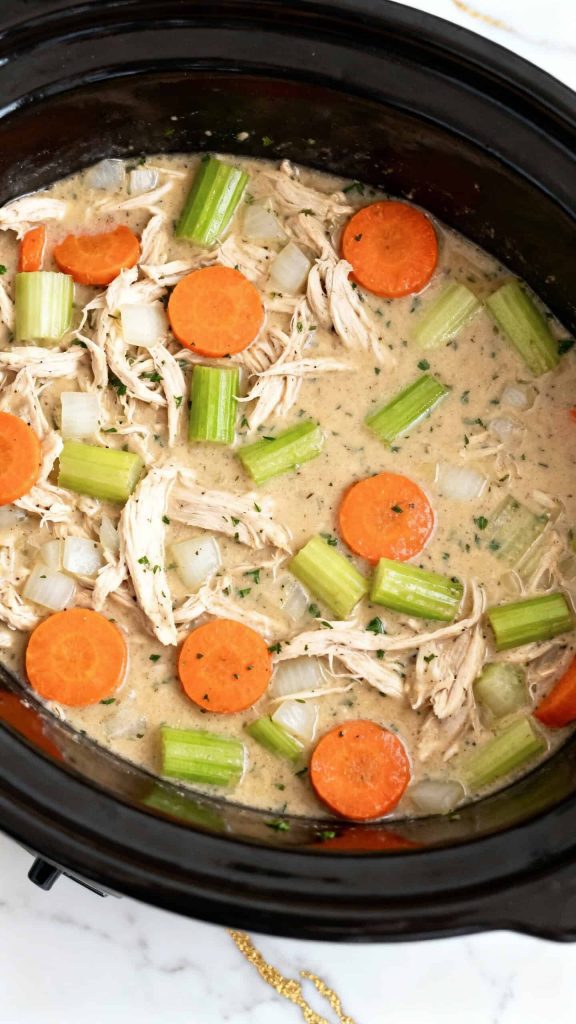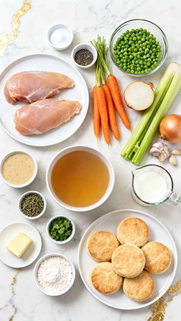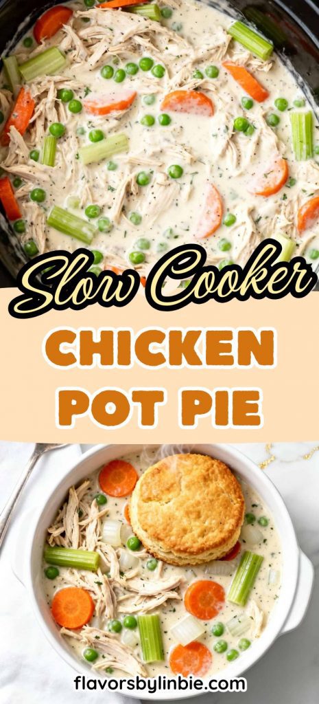 The slow cooking lets the chicken absorb all the herbs and broth, so it’s tender and flavorful. The flour and butter roux binds with the cream to thicken the sauce just right, giving that classic creamy pot pie feel. Finishing with the biscuits gives it that hearty, home-style top without needing a crust.