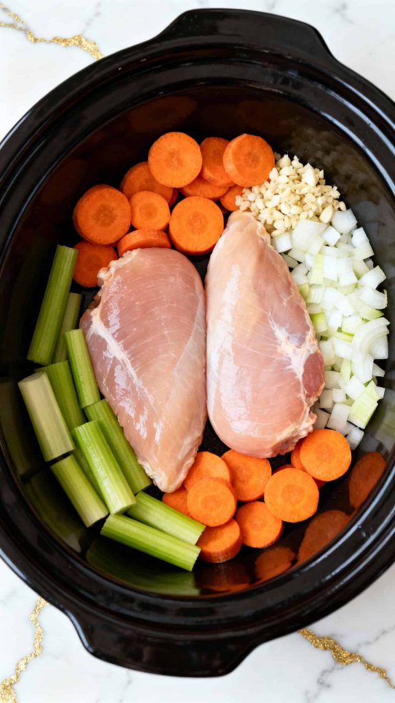 Place 1 ½ lbs chicken breasts, 3 sliced carrots, 2 sliced celery stalks, 1 diced onion, and 3 minced garlic cloves into the slow cooker.