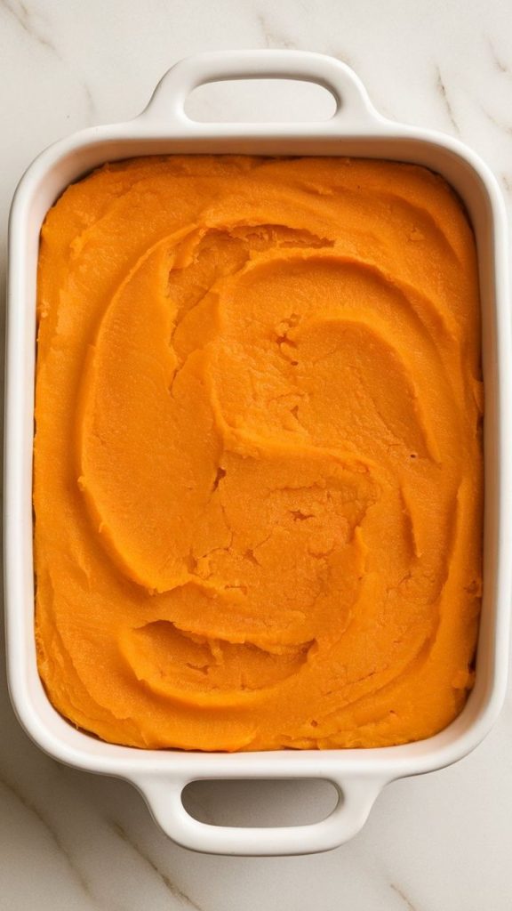 Spread the sweet potato mixture evenly into a greased 9×13-inch baking dish.
