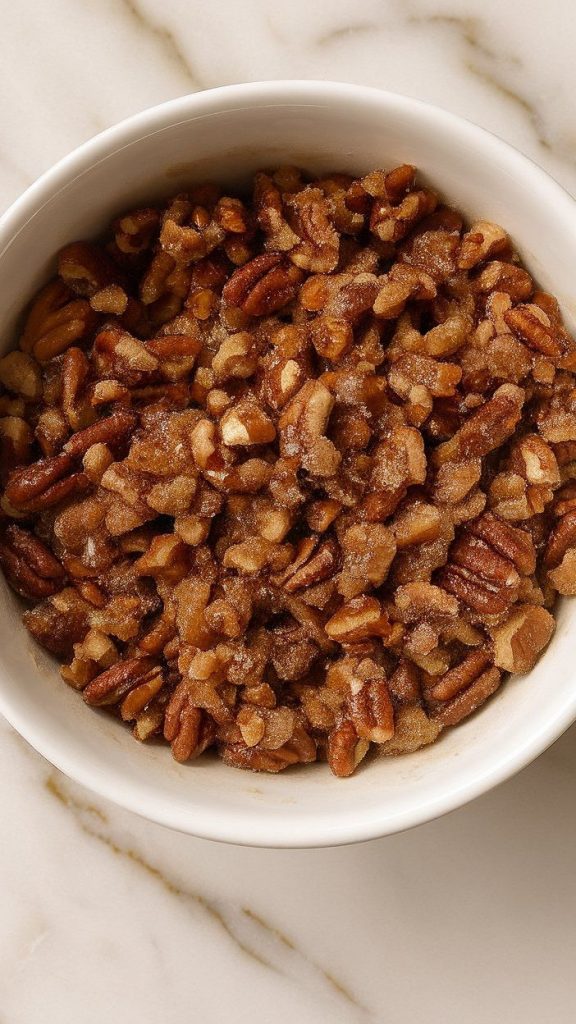 In a small bowl, mix 1 cup chopped pecans, ½ cup brown sugar, ⅓ cup flour, and 4 tbsp melted butter until crumbly.