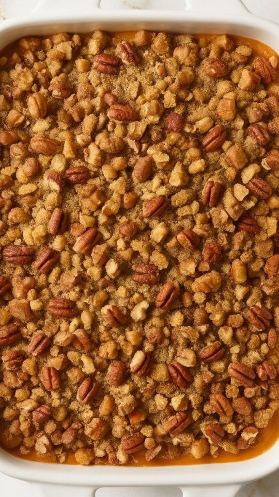 Sprinkle the pecan topping evenly over the sweet potato mixture in the baking dish.