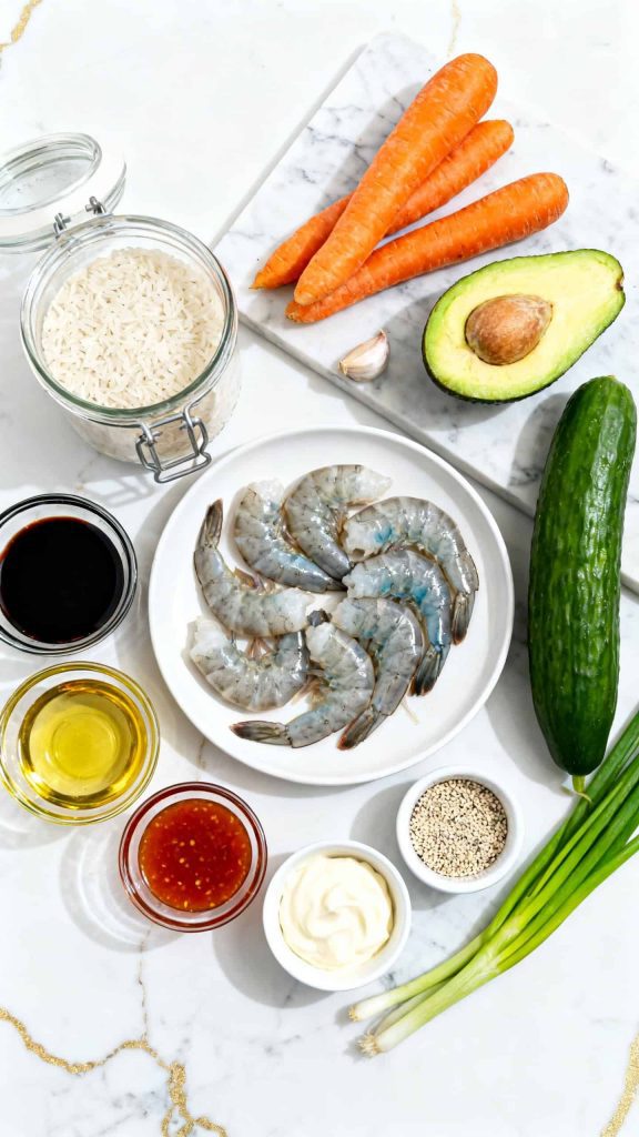 In two round bowls, divide cooked rice. Top each with shrimp, 1/2 sliced avocado, 1/4 cup shredded carrots, 1/4 cup diced cucumber, drizzle with spicy mayo, and sprinkle with 1/2 tsp sesame seeds and some sliced green onion.