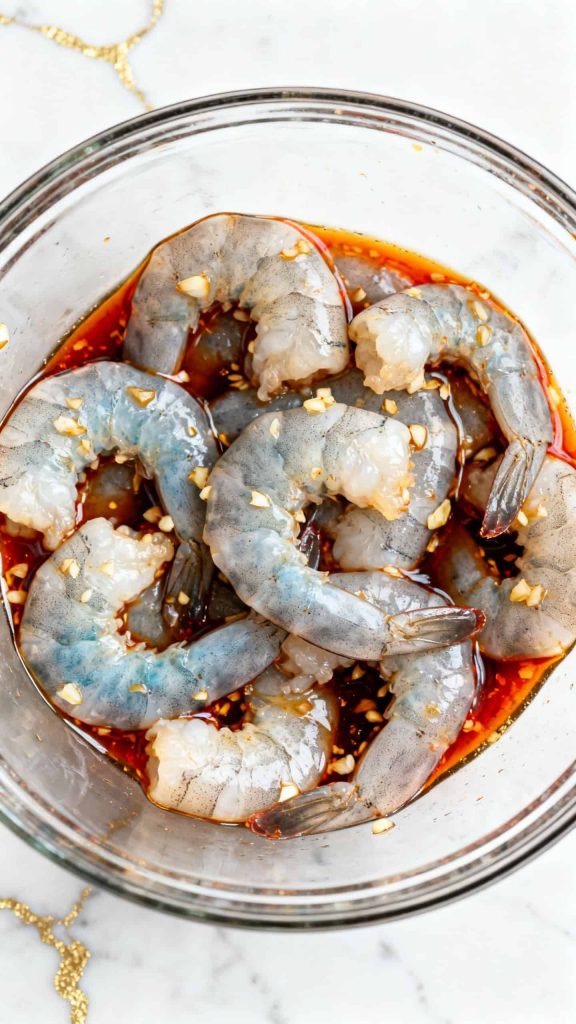 In a bowl, toss 1 lb raw shrimp with 1 tbsp soy sauce, 1 tbsp sriracha, 1 tsp honey, 1 minced garlic clove, and 1 tsp sesame oil. Let sit for 5–10 minutes while rice finishes.