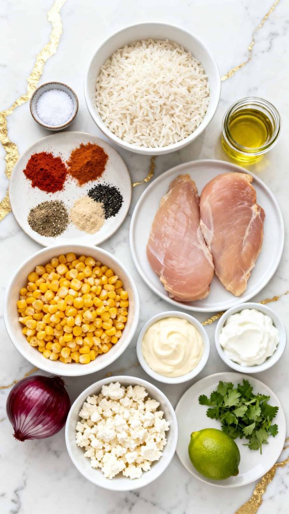 Spoon the cooked rice into a serving bowl. Top with the sliced chicken, then add a generous scoop of the creamy street corn mixture. Serve with a lime wedge on the side.