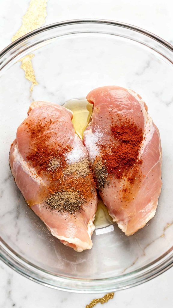 Rub 2 large raw chicken breasts with 1 tablespoon olive oil. Sprinkle evenly with 1 teaspoon chili powder, 1 teaspoon smoked paprika, 1 teaspoon garlic powder, ½ teaspoon salt, and ½ teaspoon black pepper, coating both sides fully.