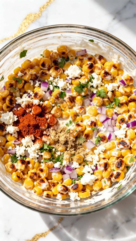 In a mixing bowl, combine the warm charred 2 cups corn kernels with ⅓ cup mayonnaise, ¼ cup sour cream, ½ teaspoon chili powder, ½ teaspoon smoked paprika, 1 tablespoon freshly squeezed lime juice, ½ cup crumbled cotija cheese, ¼ cup diced red onion, and ¼ cup chopped cilantro. Stir until creamy and fully mixed.