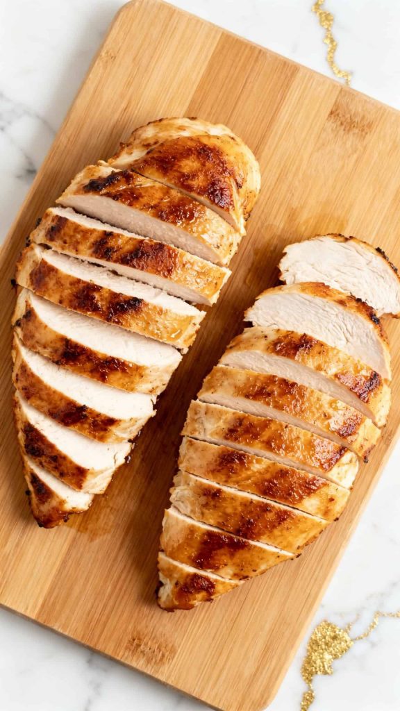 After resting for 5 minutes, slice the cooked chicken breasts into thin strips.
