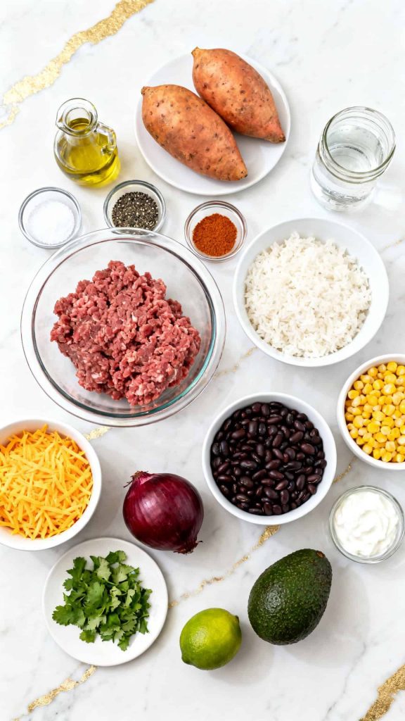 Store leftovers in airtight containers in the fridge for up to 4 days. Keep toppings like avocado and sour cream separate if possible. Reheat the rice, beans, sweet potatoes, and beef in the microwave or on the stove before adding fresh toppings.