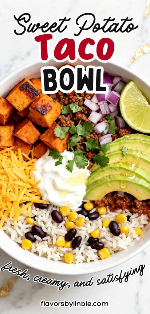 The first time I made this bowl, I was trying to use up sweet potatoes in my kitchen. I tossed them with olive oil and roasted them, then built a taco bowl around them. One bite in, and I knew this was staying in my dinner rotation.
