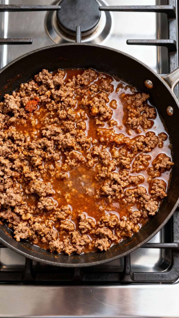 Heat 1 tablespoon olive oil in a skillet over medium heat. Add 1 pound ground beef and cook for 6–8 minutes until browned. Stir in 1 packet taco seasoning and ½ cup water. Simmer for 3–4 minutes until thickened.