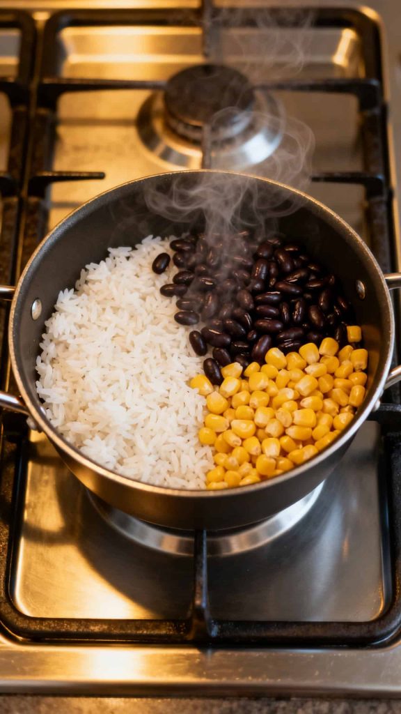 Add 2 cups cooked white rice, 1 cup black beans (drained and rinsed), and 1 cup corn to a saucepan. Heat for 3–5 minutes until warmed through.