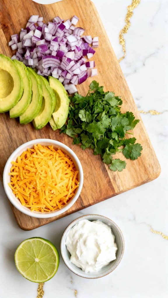 Dice ½ cup red onion, slice 1 avocado, and chop ¼ cup cilantro. Measure ½ cup shredded cheddar cheese, ½ cup sour cream, and juice of 1 lime.