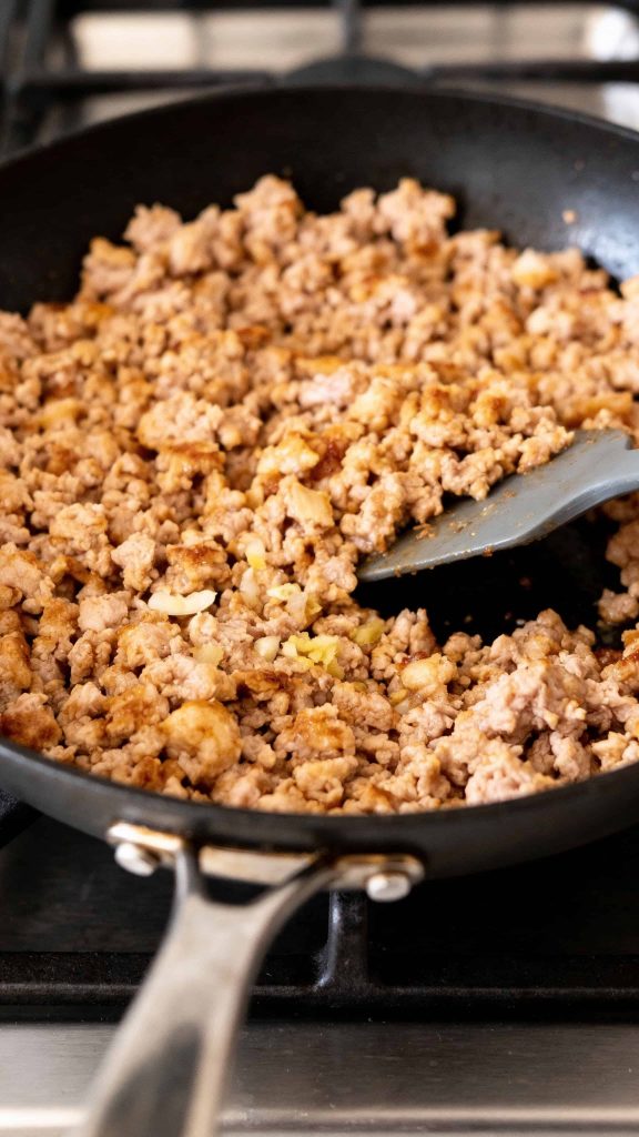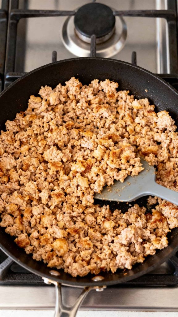 Heat a skillet over medium heat on the stove. Add 1 pound ground turkey and cook for 5–6 minutes, breaking it apart with a spatula until browned and fully cooked.