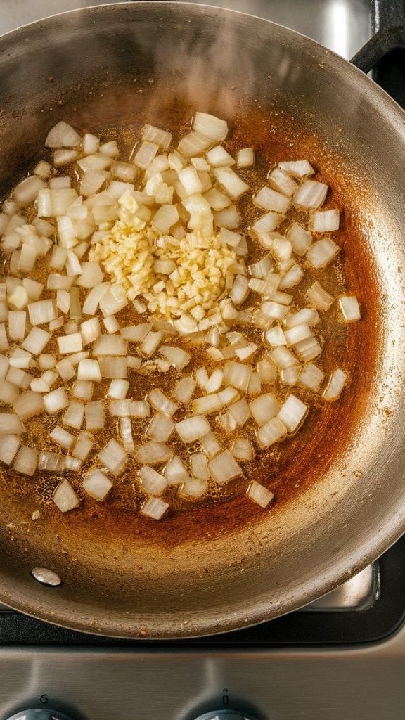 Add diced onion and minced garlic to the same pot. Cook until the onions are soft and translucent, scraping up the brown bits from the beef.