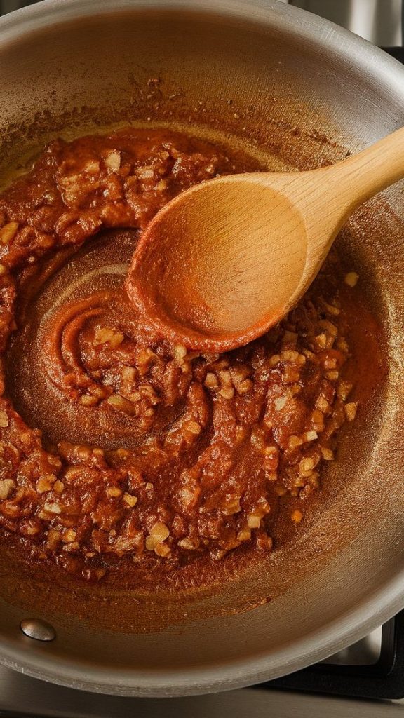 Stir in 2 tbsp tomato paste and 2 tbsp flour, mixing well to coat the onions and garlic. Cook for 1–2 minutes until thickened and deep red.