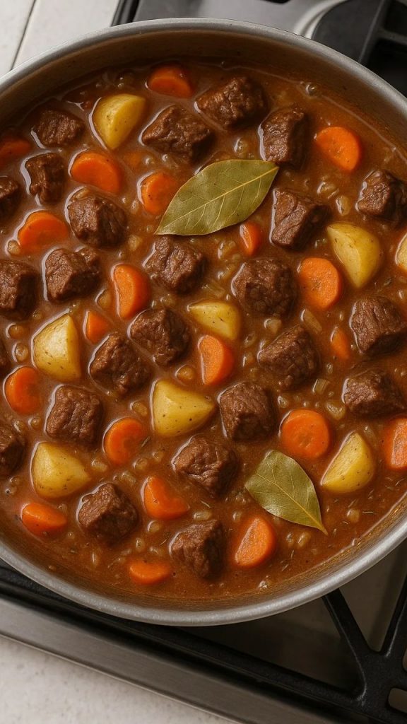 Pour in 1 cup red wine (or broth), stirring to lift any bits stuck to the bottom. Add back the browned beef, 4 cups beef broth, 2 tsp Worcestershire sauce, 1 tsp thyme, 1 tsp rosemary, 2 bay leaves, carrots, and potatoes. Bring to a boil, then reduce heat and simmer for 2 hours until beef is tender.